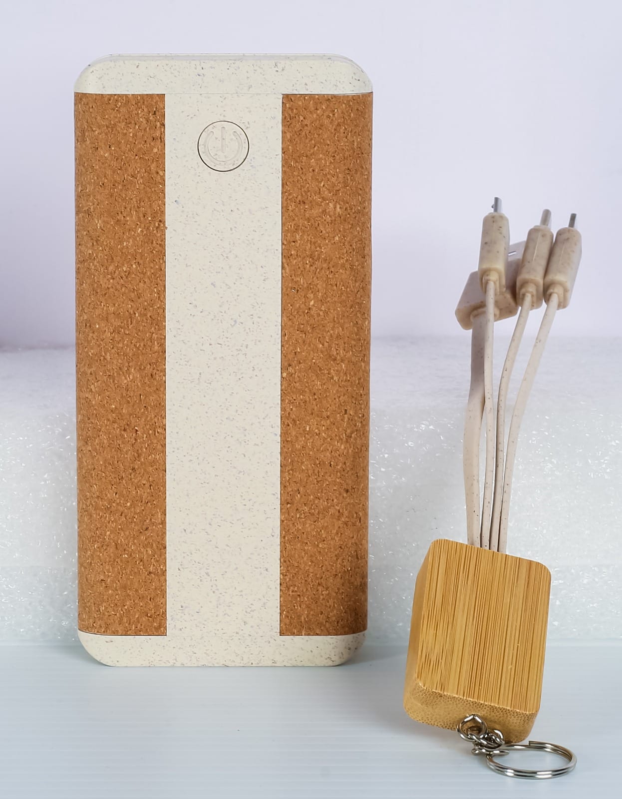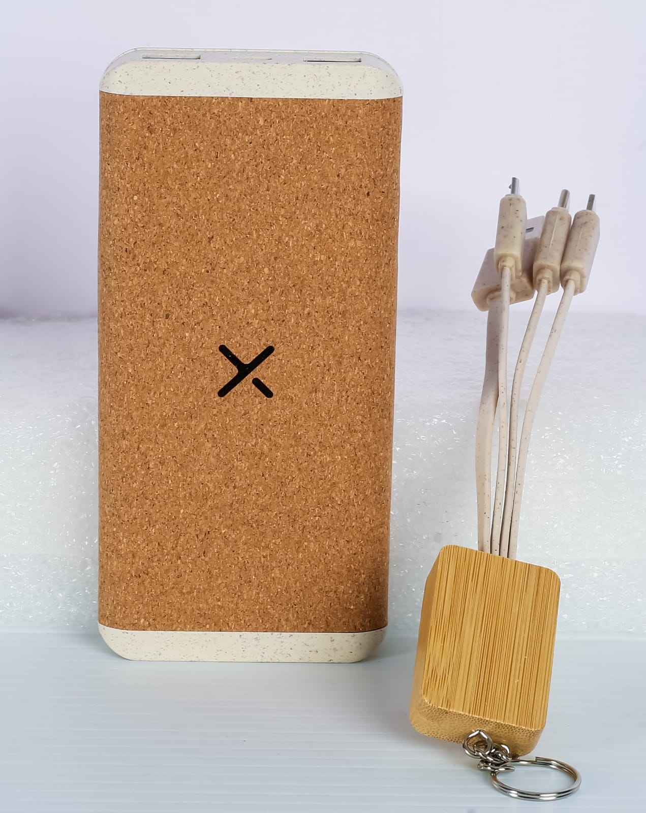 POWER BANK WOODEN 002 10000MAH featuring natural bamboo and cork casing with wireless charging capability and multi-connector cablePOWER BANK WOODEN 002 10000MAH featuring natural bamboo and cork casing with wireless charging capability and multi-connector cable